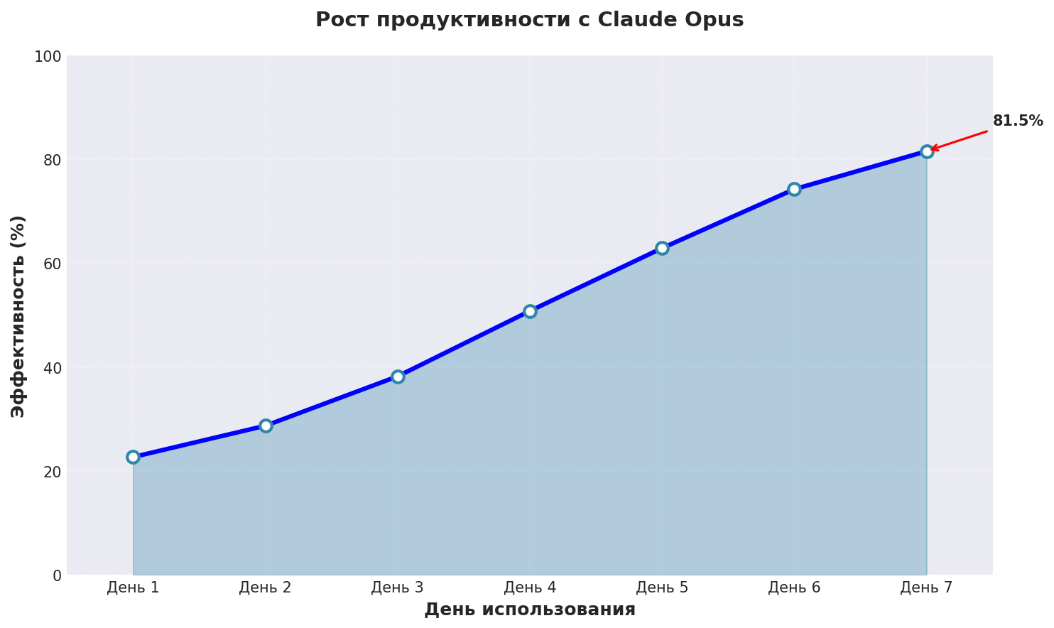 График показывает реальный рост эффективности сгенерировать описание нейросетью при использовании Claude Opus с применением описанных техник