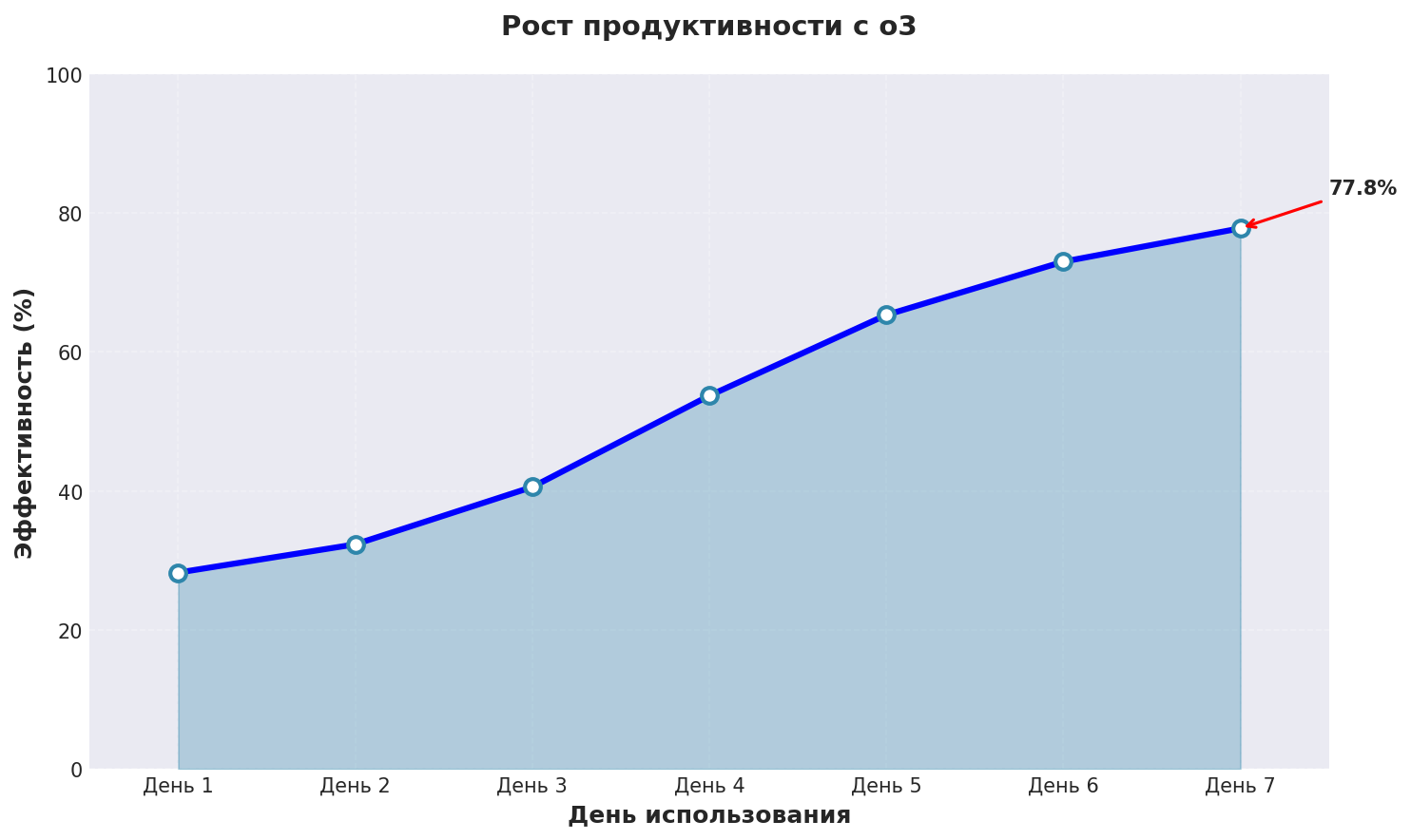 График показывает реальный рост эффективности написать с помощью нейросети бесплатно при использовании o3 с применением описанных техник