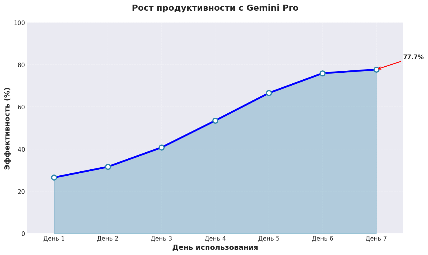 График показывает реальный рост эффективности написать текст с помощью нейросети при использовании Gemini Pro с применением описанных техник
