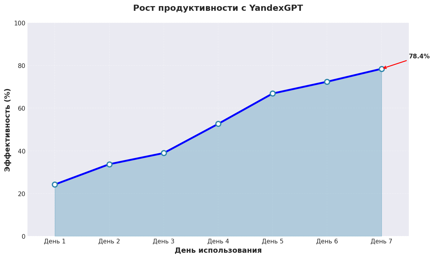 График показывает реальный рост эффективности бесплатная нейросеть для написания текста при использовании YandexGPT с применением описанных техник
