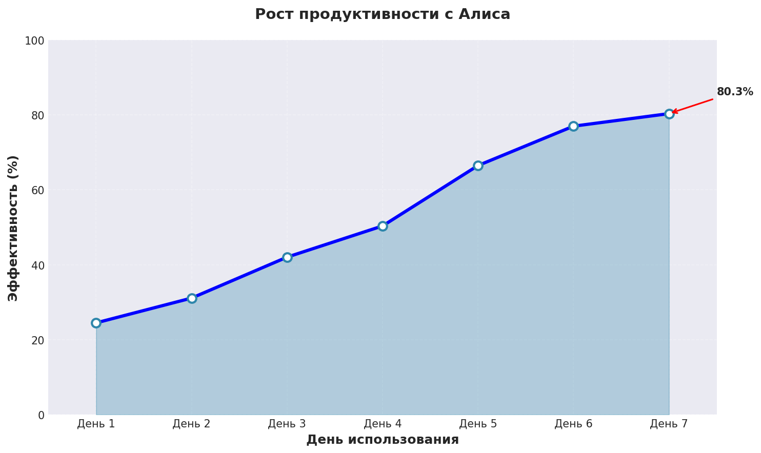 График показывает реальный рост эффективности написать с помощью нейросети при использовании Алиса с применением описанных техник