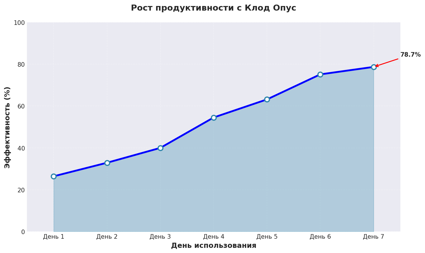 График показывает реальный рост эффективности нейросеть для генерации текста без регистрации при использовании Клод Опус с применением описанных техник