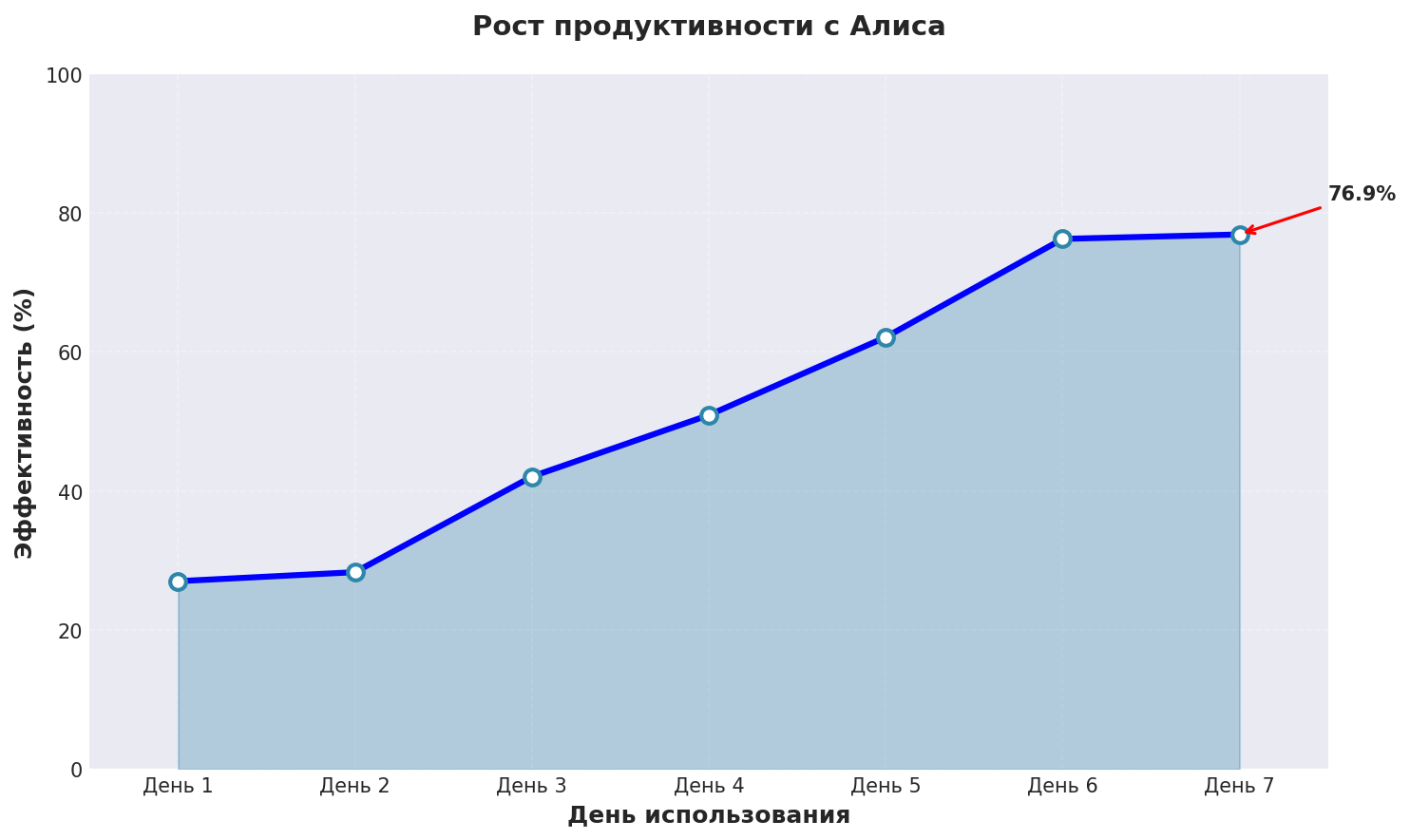 График показывает реальный рост эффективности нейросеть для общения при использовании Алиса с применением описанных техник