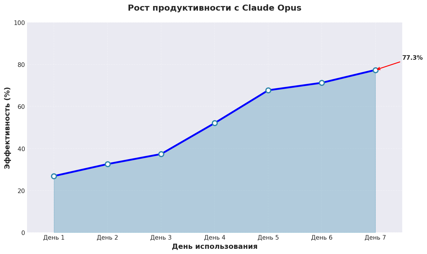 График показывает реальный рост эффективности описание с помощью нейросети при использовании Claude Opus с применением описанных техник
