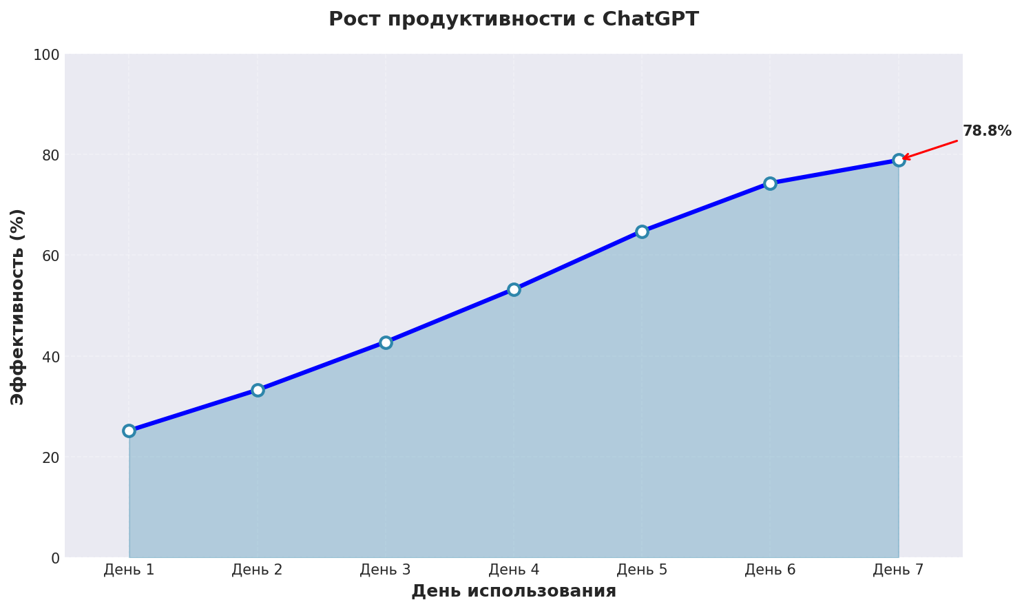График показывает реальный рост эффективности нейросеть по описанию бесплатно при использовании ChatGPT с применением описанных техник
