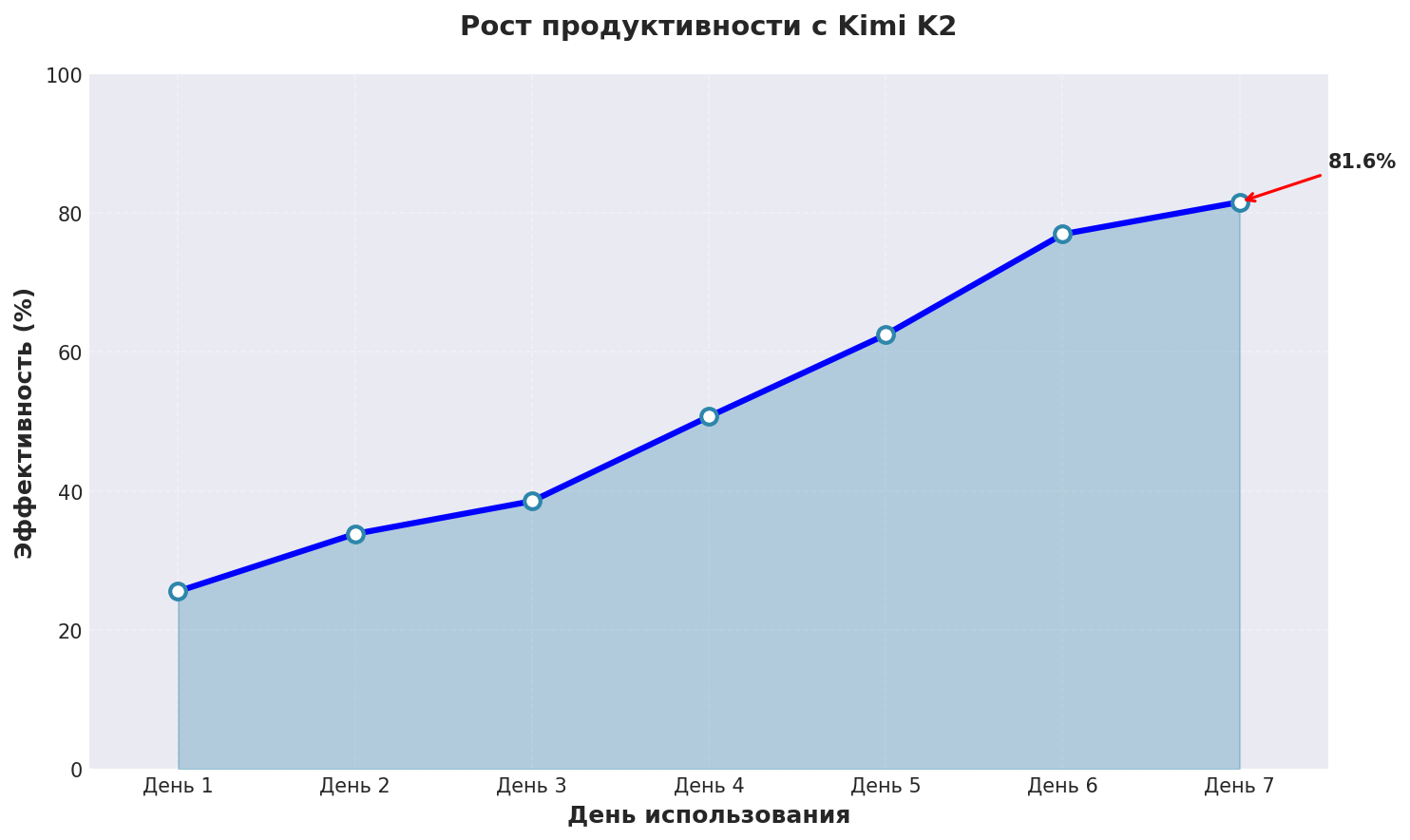 График показывает реальный рост эффективности нейросети переводят при использовании Kimi K2 с применением описанных техник