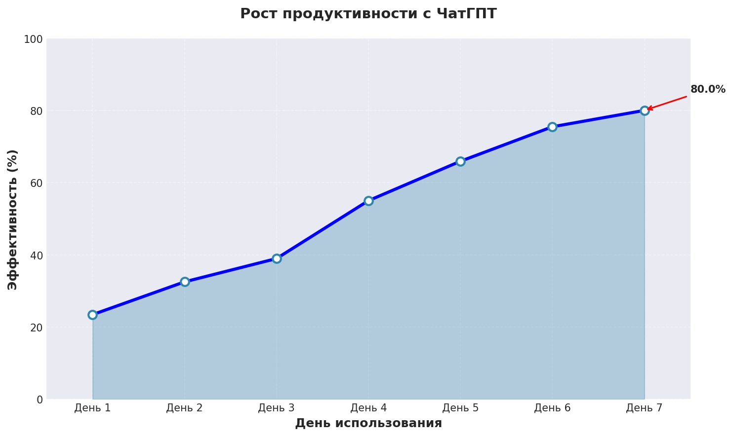 График показывает реальный рост эффективности написать текст с помощью нейросети при использовании ЧатГПТ с применением описанных техник