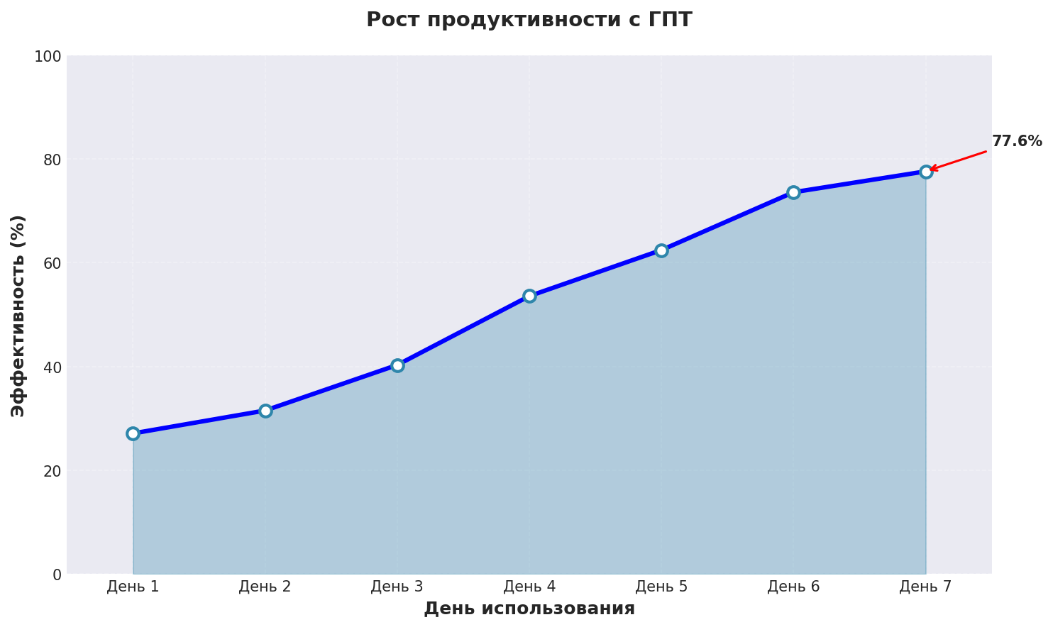 График показывает реальный рост эффективности нейросеть пишущая тексты при использовании ГПТ с применением описанных техник