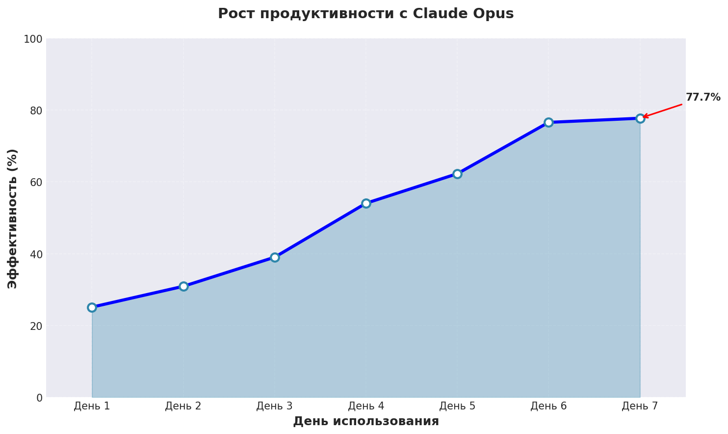График показывает реальный рост эффективности составить текст в нейросети при использовании Claude Opus с применением описанных техник