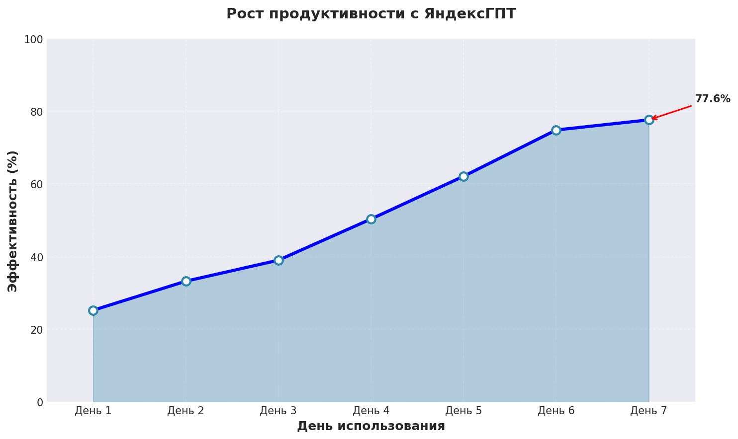 График показывает реальный рост эффективности нейросеть сгенерировать текст при использовании ЯндексГПТ с применением описанных техник