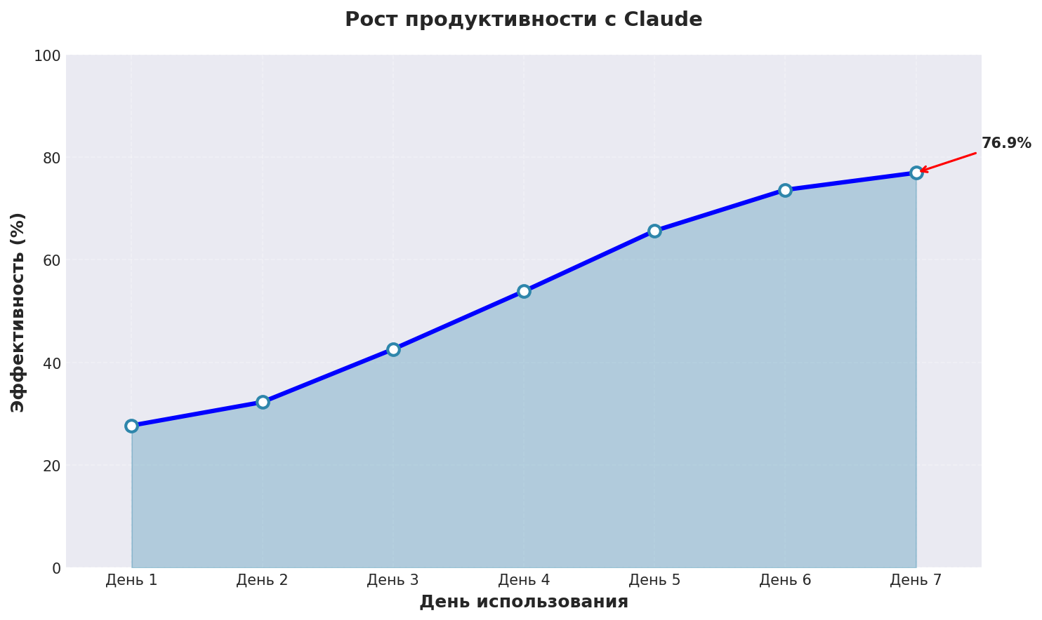 График показывает реальный рост эффективности нейросеть для создания текста при использовании Claude с применением описанных техник