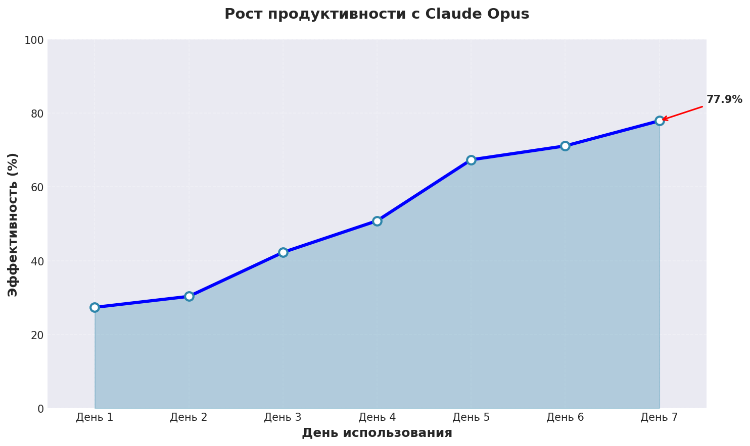 График показывает реальный рост эффективности нейросеть для генерации текста бесплатно при использовании Claude Opus с применением описанных техник