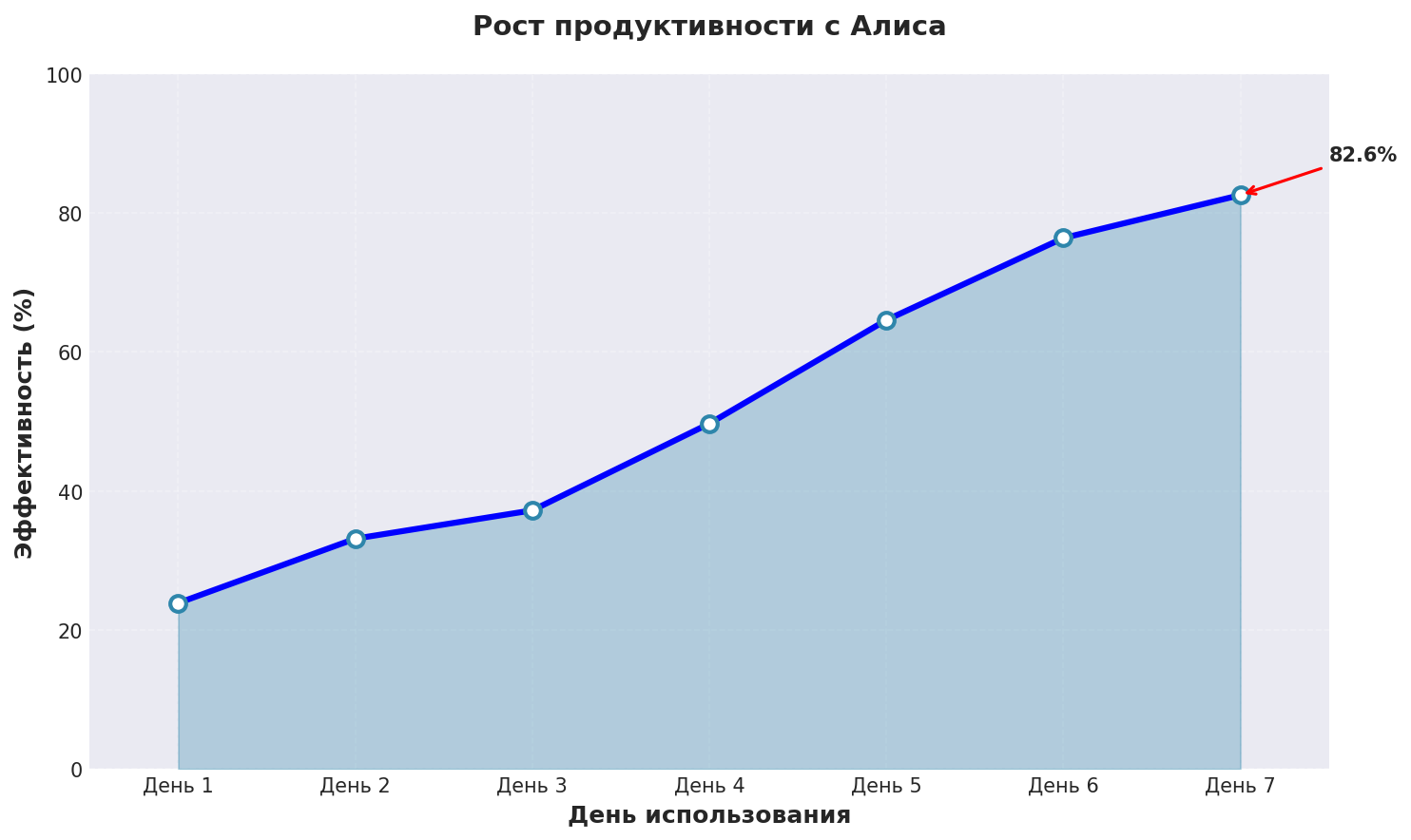 График показывает реальный рост эффективности нейросеть для генерации текста онлайн при использовании Алиса с применением описанных техник