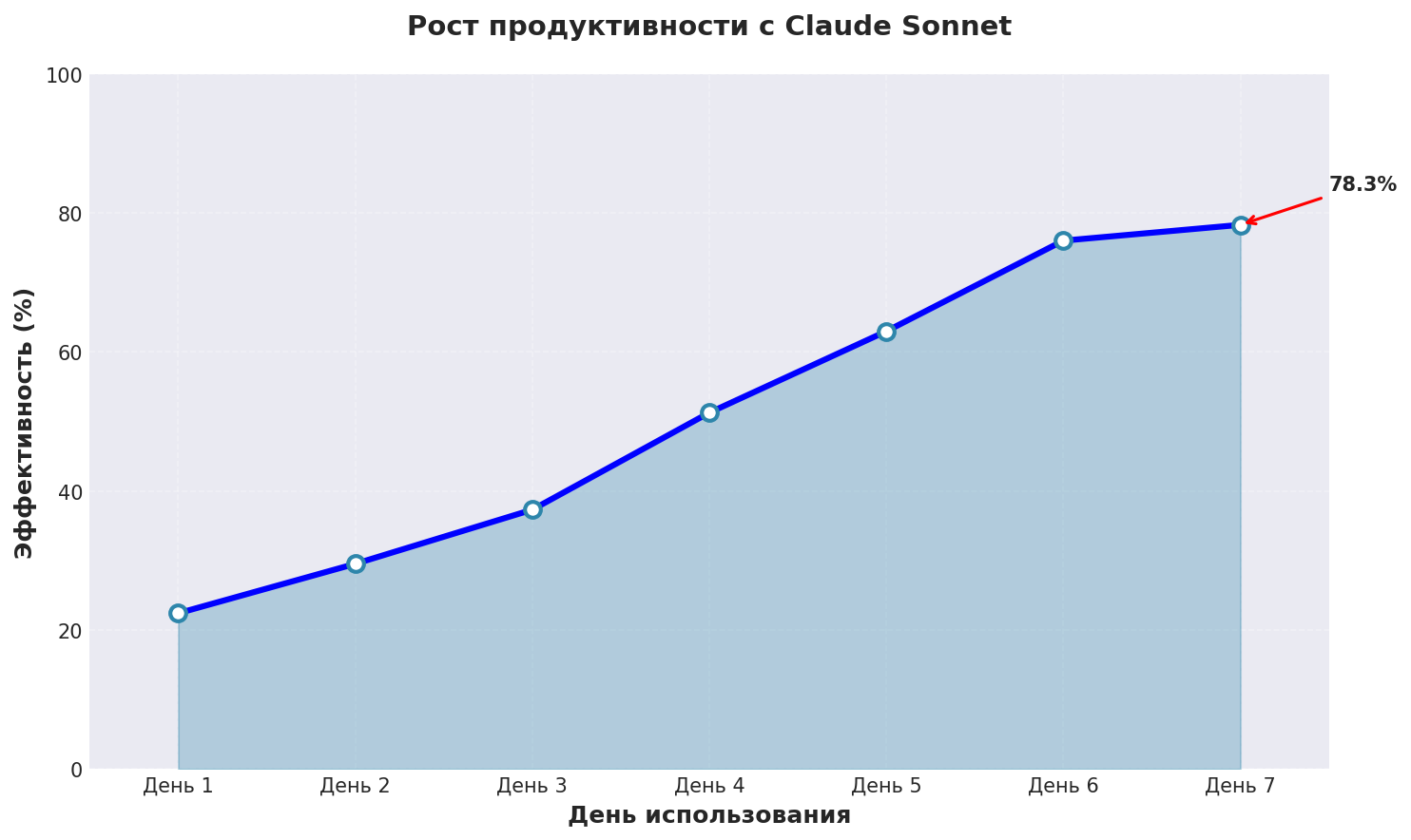 График показывает реальный рост эффективности нейросеть написать пост бесплатно при использовании Claude Sonnet с применением описанных техник