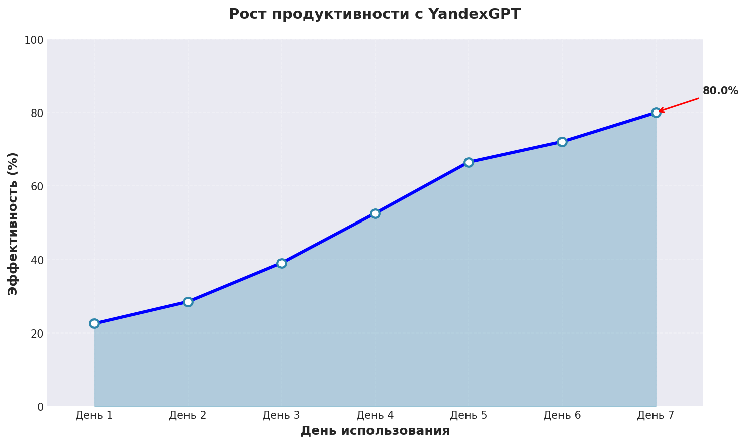 График показывает реальный рост эффективности нейросеть для создания текста при использовании YandexGPT с применением описанных техник