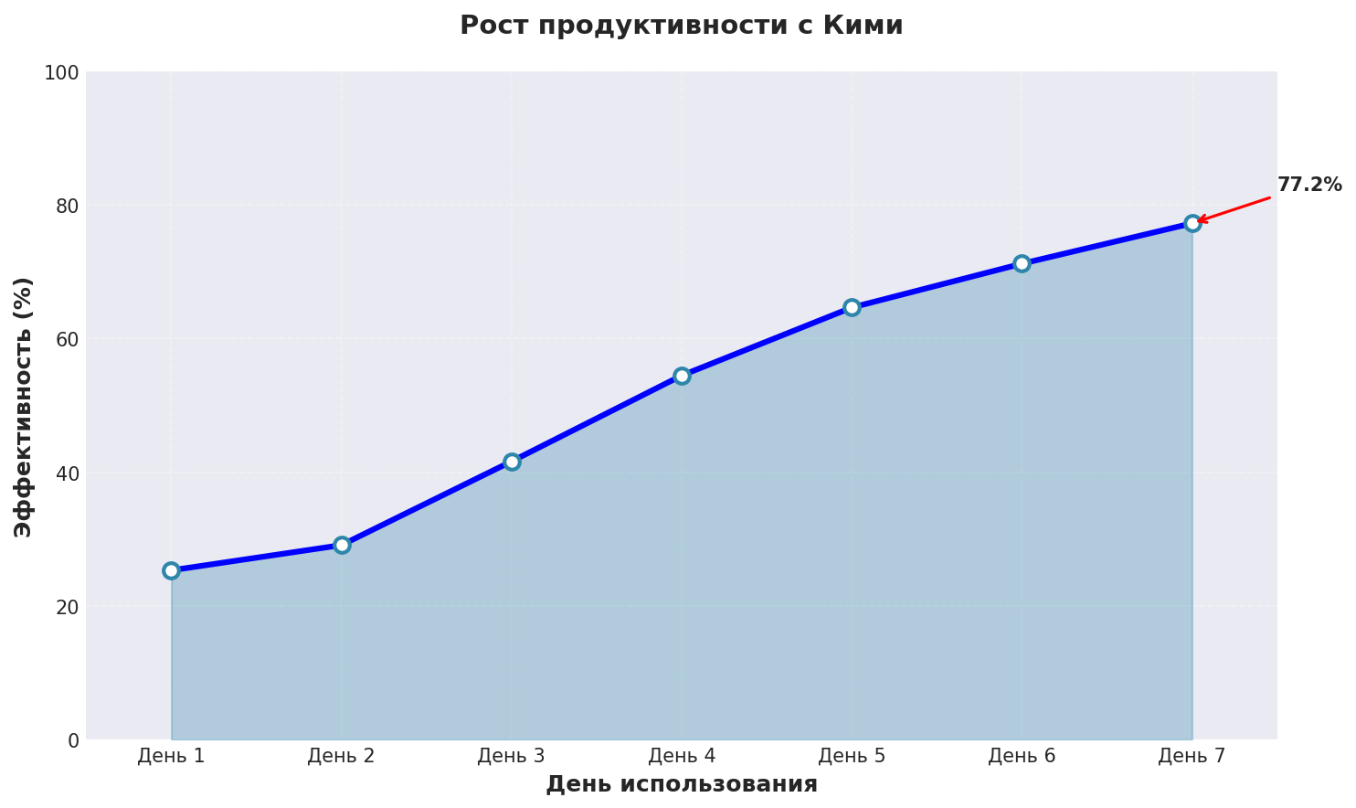 График показывает реальный рост эффективности написать текст нейросетью онлайн бесплатно без регистрации при использовании Кими с применением описанных техник