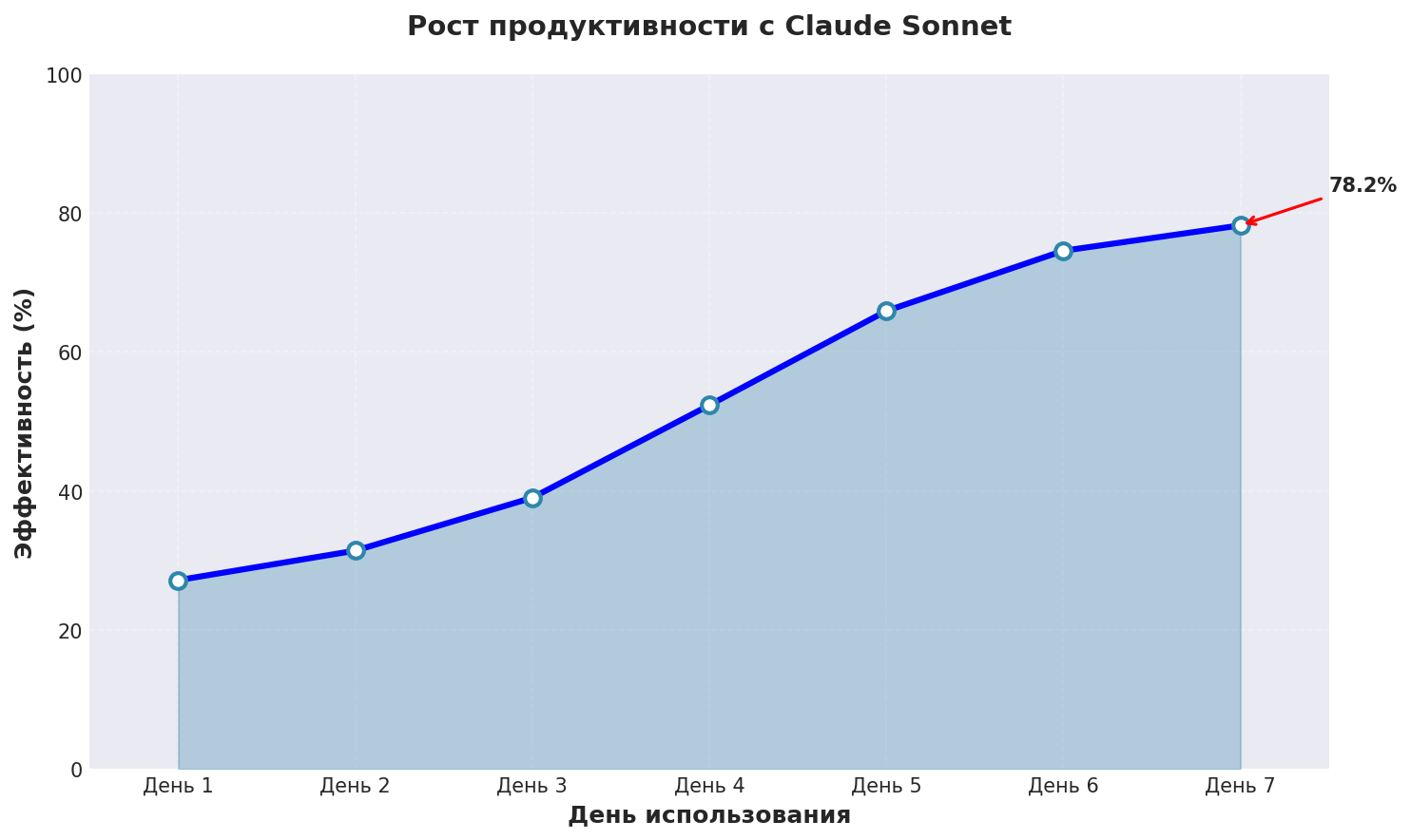 График показывает реальный рост эффективности нейросеть создание описания бесплатно при использовании Claude Sonnet с применением описанных техник