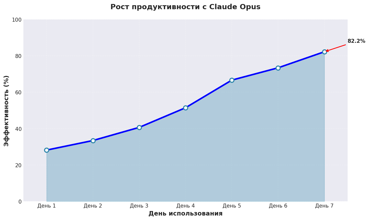 График показывает реальный рост эффективности нейросеть тексты на русском онлайн при использовании Claude Opus с применением описанных техник