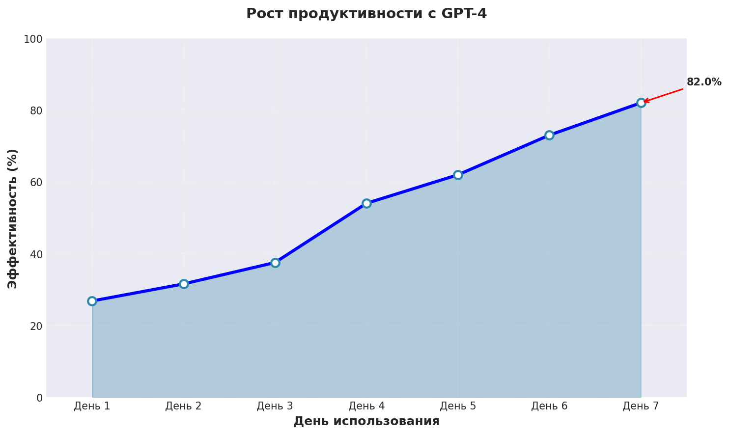 График показывает реальный рост эффективности пост с помощью нейросети при использовании GPT-4 с применением описанных техник