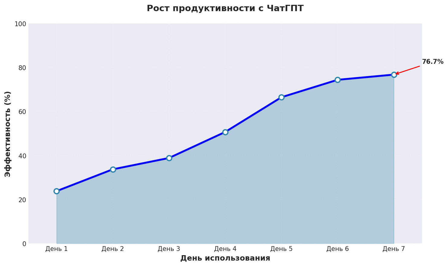 График показывает реальный рост эффективности написать пост с помощью нейросети при использовании ЧатГПТ с применением описанных техник