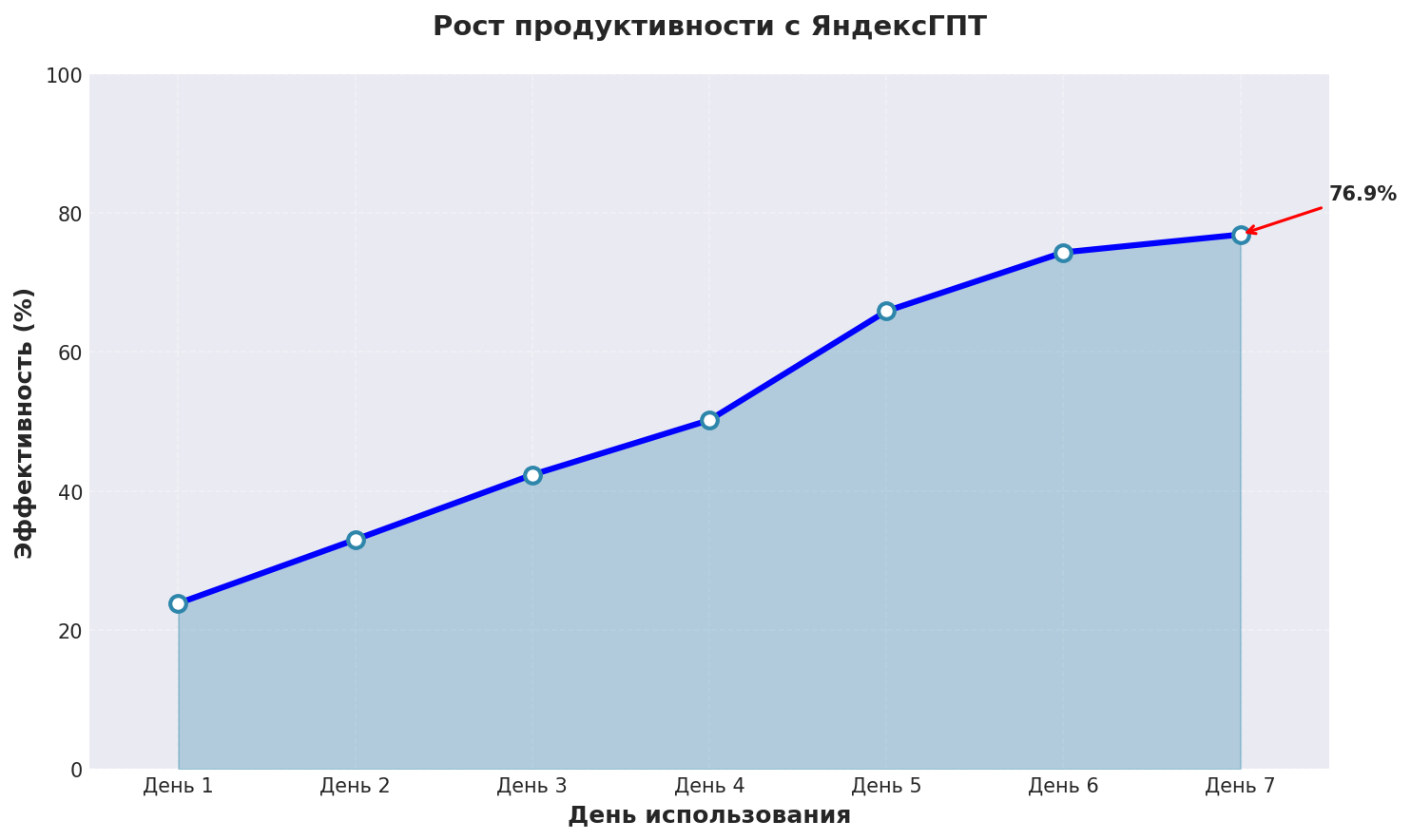 График показывает реальный рост эффективности написать пост с помощью нейросети при использовании ЯндексГПТ с применением описанных техник