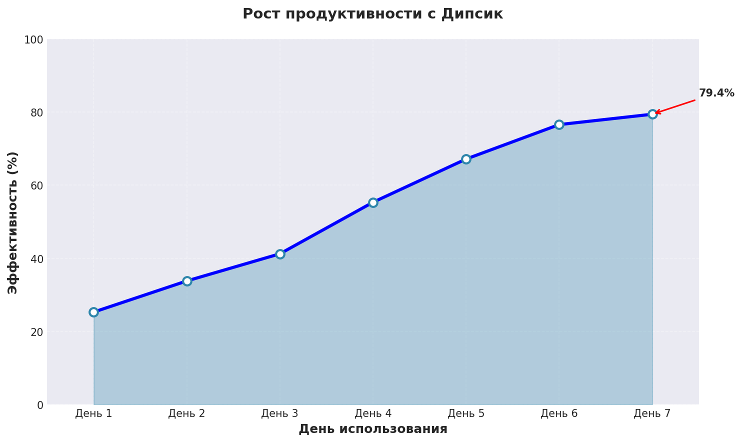 График показывает реальный рост эффективности нейросеть написать пост при использовании Дипсик с применением описанных техник