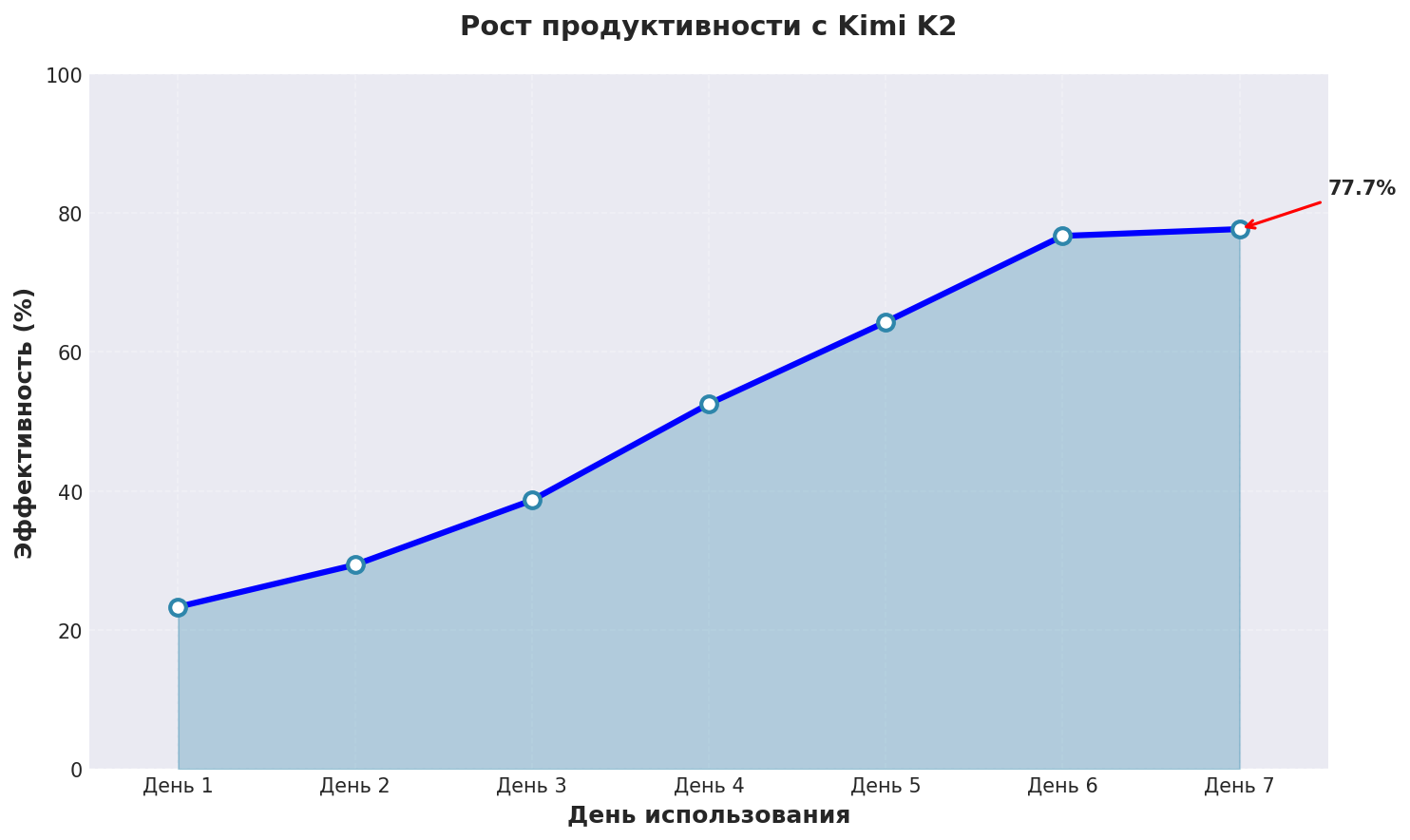 График показывает реальный рост эффективности нейросеть написать пост бесплатно при использовании Kimi K2 с применением описанных техник