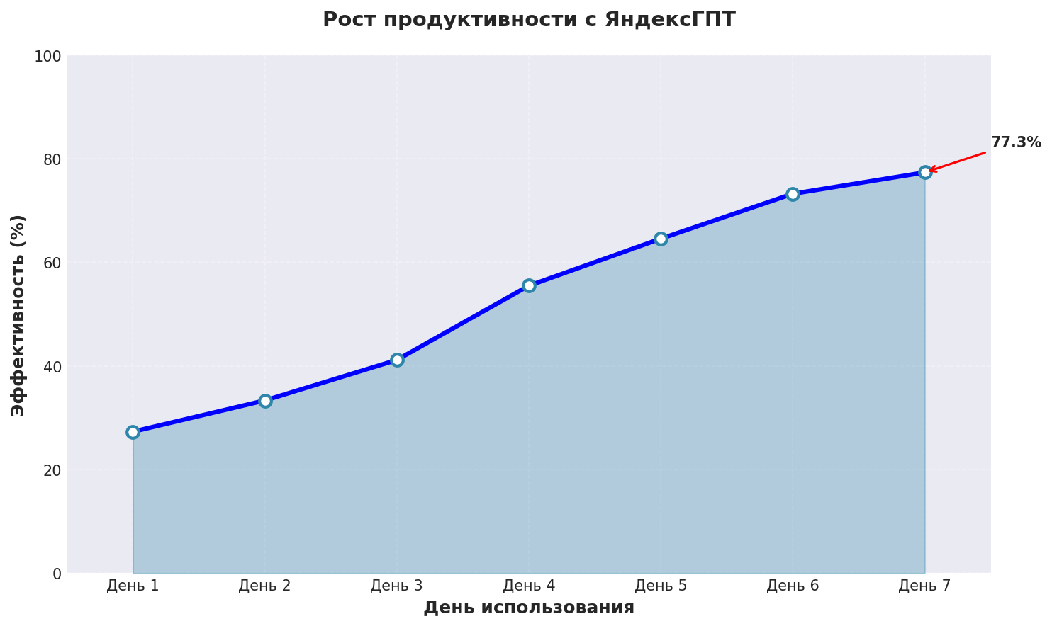 График показывает реальный рост эффективности пост с помощью нейросети при использовании ЯндексГПТ с применением описанных техник