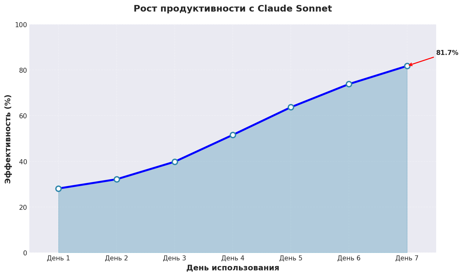 График показывает реальный рост эффективности нейросеть для генерации описания при использовании Claude Sonnet с применением описанных техник