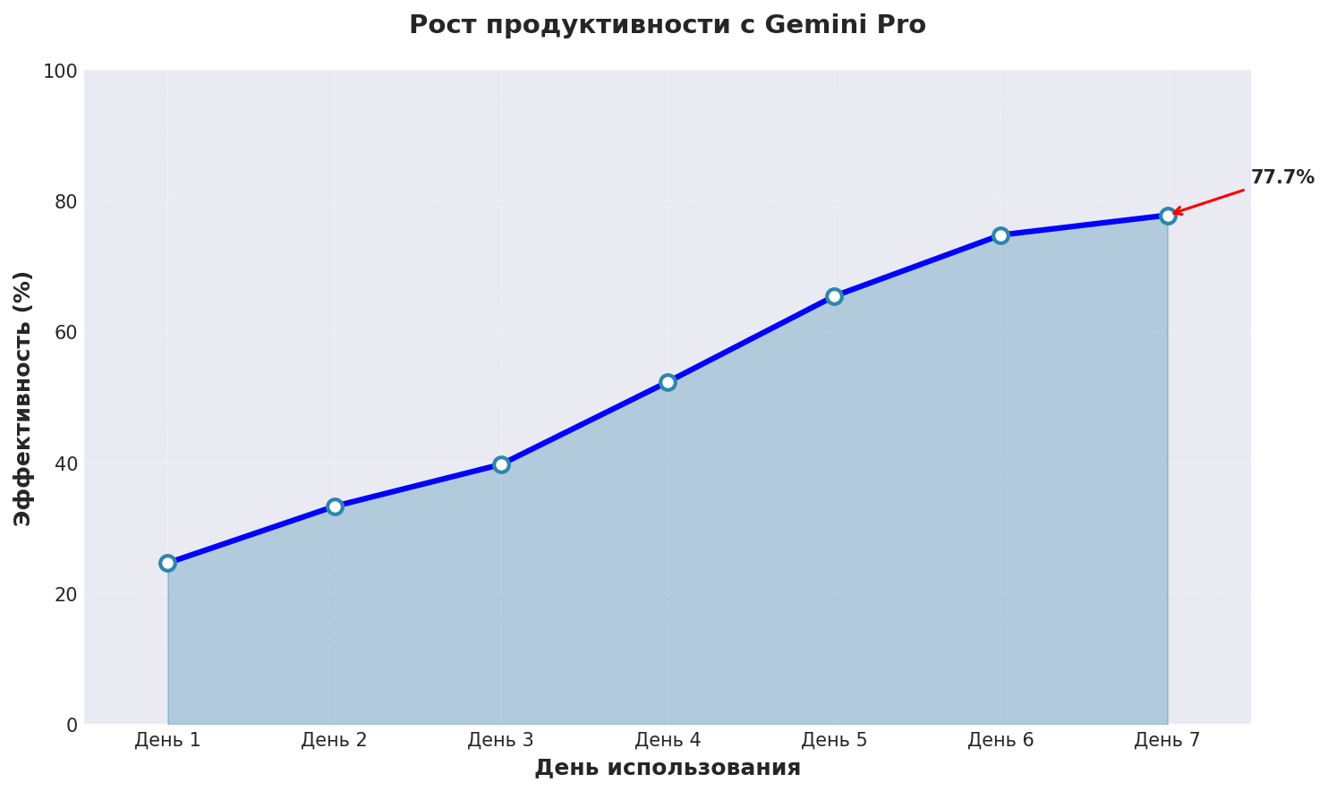 График показывает реальный рост эффективности нейросеть для контента при использовании Gemini Pro с применением описанных техник