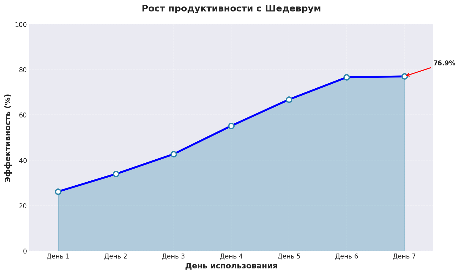 График показывает реальный рост эффективности нейросеть ответы на вопросы при использовании Шедеврум с применением описанных техник