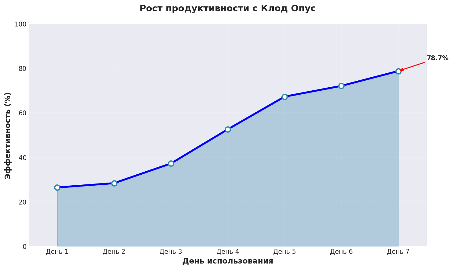 График показывает реальный рост эффективности нейросеть пишет текст при использовании Клод Опус с применением описанных техник