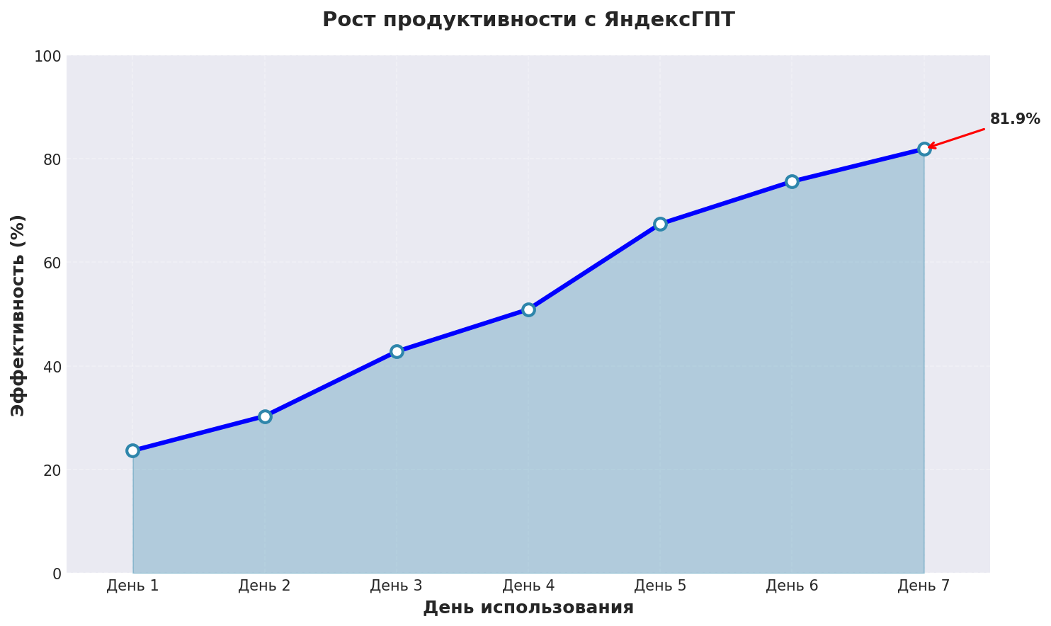 График показывает реальный рост эффективности нейросети переводят при использовании ЯндексГПТ с применением описанных техник
