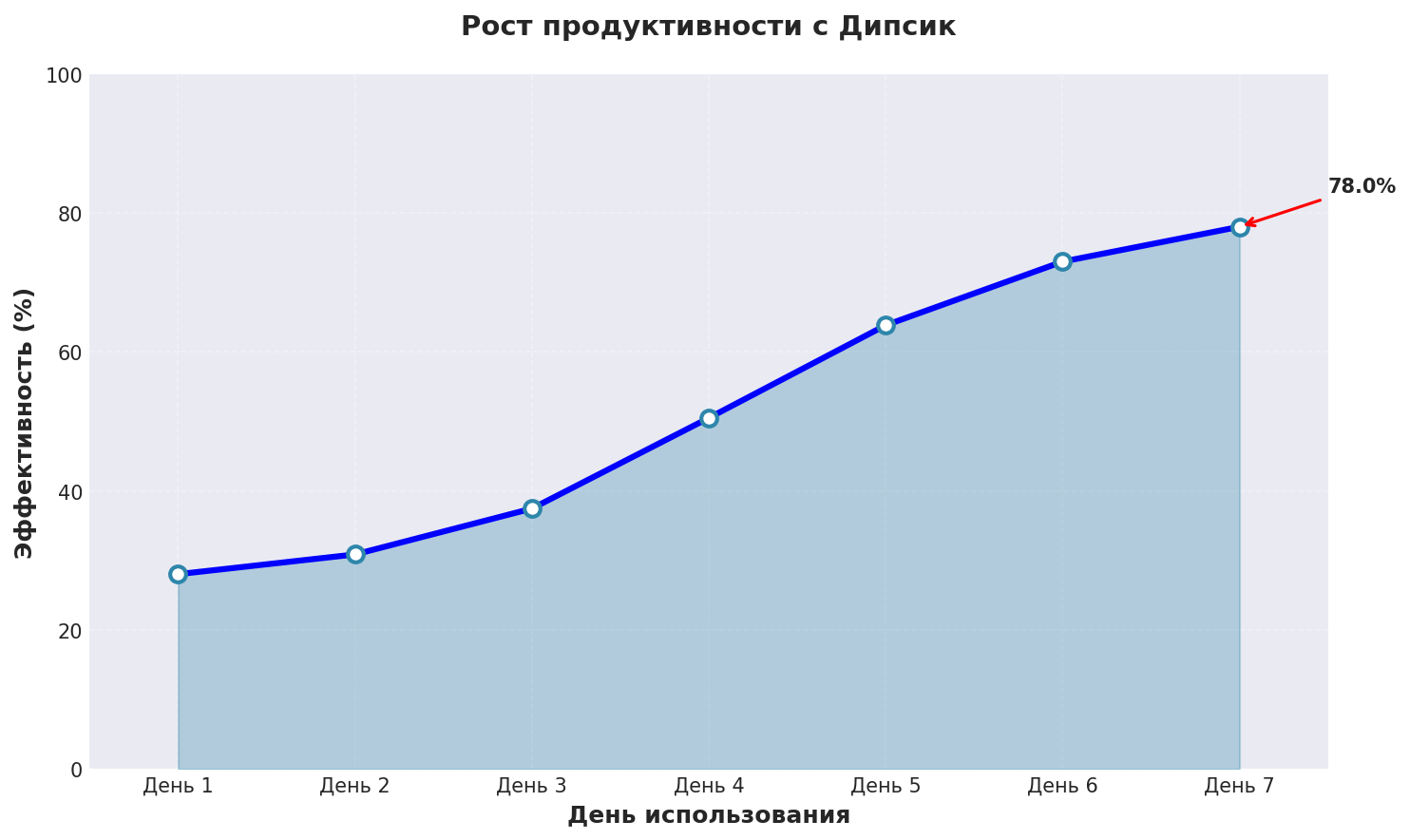 График показывает реальный рост эффективности нейросеть для генерации текста онлайн при использовании Дипсик с применением описанных техник