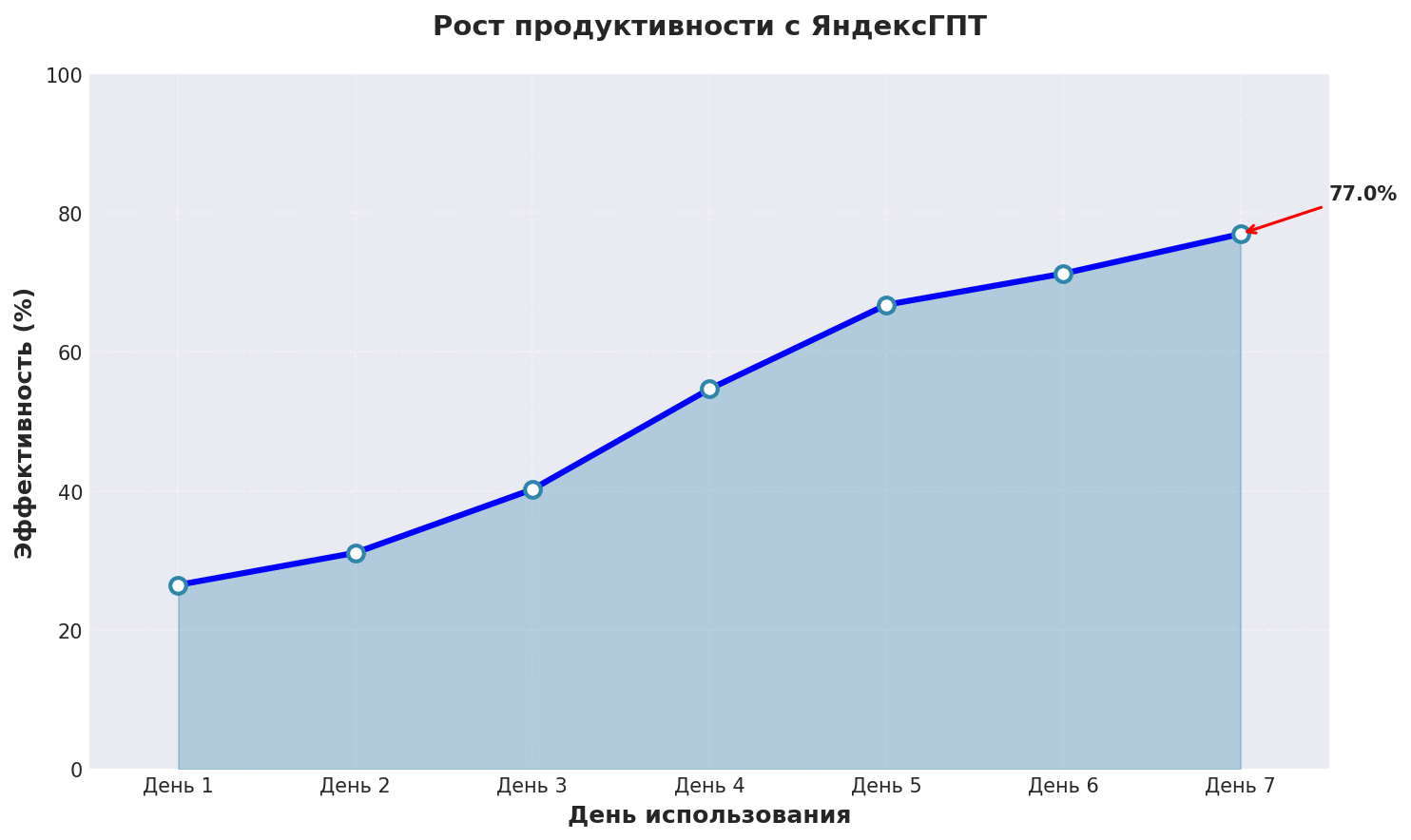 График показывает реальный рост эффективности нейросеть онлайн написать текст без регистрации при использовании ЯндексГПТ с применением описанных техник