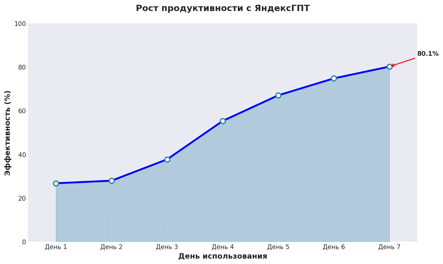 График показывает реальный рост эффективности онлайн написание нейросетью при использовании ЯндексГПТ с применением описанных техник