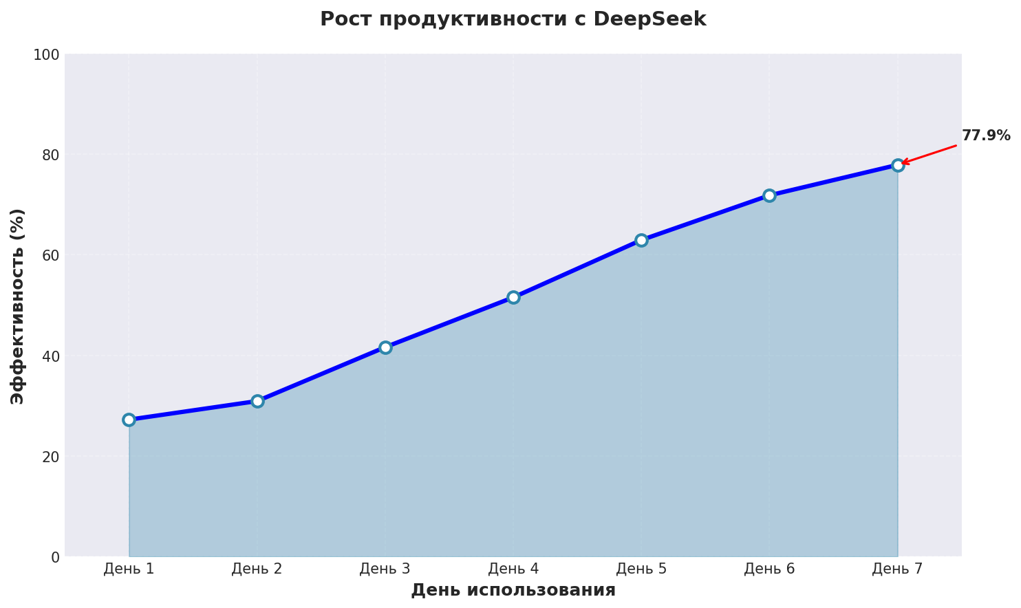 График показывает реальный рост эффективности нейросеть сгенерировать текст при использовании DeepSeek с применением описанных техник