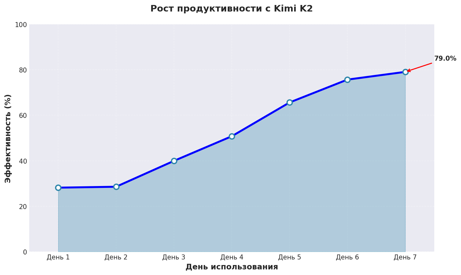 График показывает реальный рост эффективности сделать пересказ нейросетью при использовании Kimi K2 с применением описанных техник